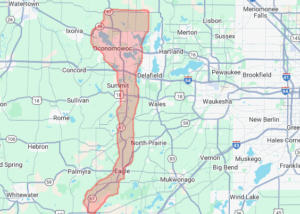 Hwy 67 corridor north from Lauderdale lakes in Elkhorn to Oconomowoc and anywhere within 2 minute’s drive to Hwy 67. Residents near Lac La Belle, Including Monterrey, not including Ixonia or Concord. Mapleton Rd is the northern border, Stone Bank the eastern border. Residents west of Okauchee Lake and near Upper and Lower Nashotah Lake included. Sawyer Rd is the Southeastern border.